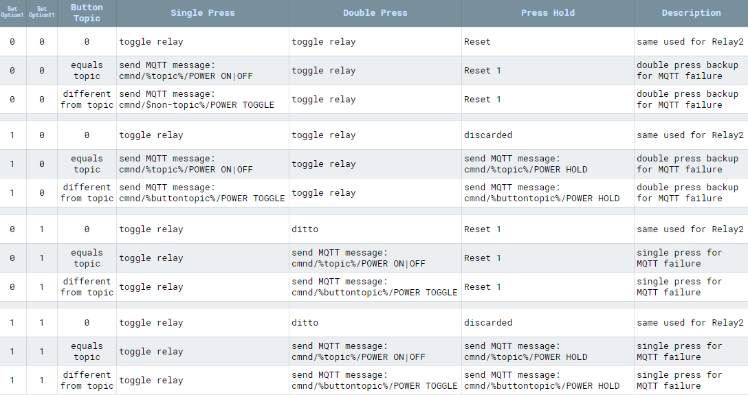 Button1 can directly control up to five relays. The number of the activated relay corresponds to the number of button presses and this feature is not present in the other buttons. When ButtonTopic is set to default 0 a button will always send its state for rules.