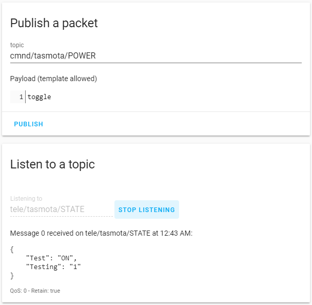 To test control of a relay or light, as Publish a packet topic enter cmnd/%topic%/POWER with payload toggle. When you click PUBLISH your device should switch state and a JSON resc