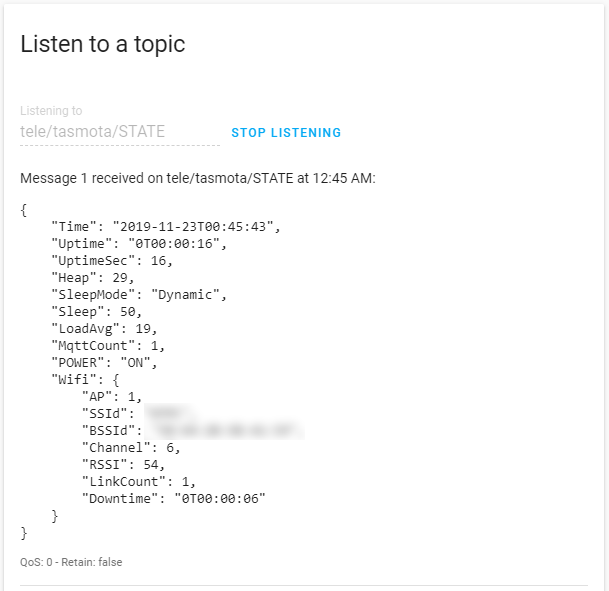In Home Assistant web UI go to Configuration - Integrations, locate MQTT broker card and click on CONFIGURE. Subscribe to tele/%topic%/STATE and click START LISTENING. You should see a JSON response from your device inside 5 minutes.