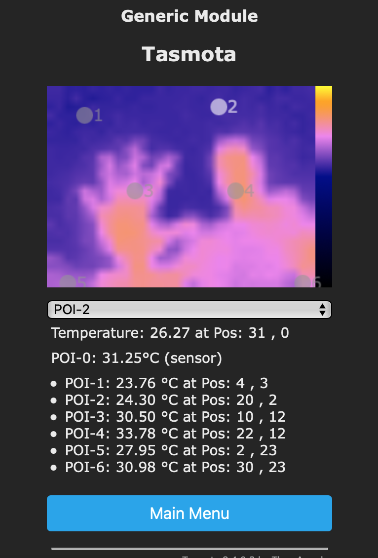 Intended use case is to measure multiple points of interest of an object without the need to directly put a sensor on it, for instance if you are not allowed to apply hardware modifications to a heating. The update frequency of the measurements is approximately 1 per second. In the first driver version 6 POI‘s are freely selectable (POI1..6). POI-0 is reserved for the ambient temperature of the sensor (Ta).