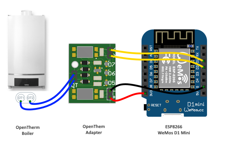 OpenTherm protocol requires a simple low voltage two-wire connection to the boiler, but voltage levels (7..15V) still much higher than ESP8266 levels, which requires OpenTherm Adapter.